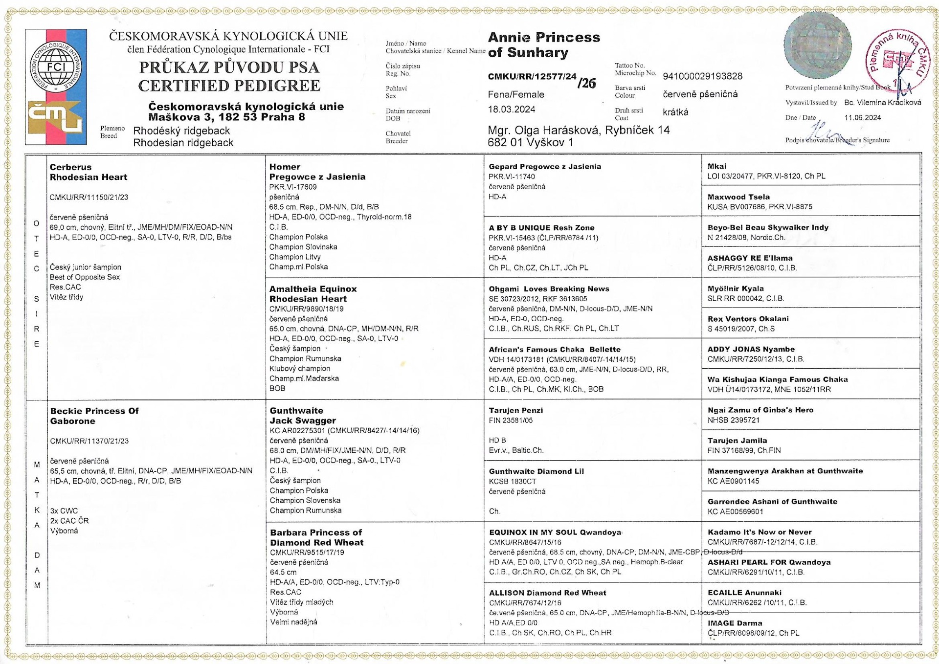 Candidate Interchampion C.I.B, JCh PL, Champion SK, PL, BiH, Candidate Champion CZ, HU, ClubChampion KCHRR, ČKRR, Multi BOB, Best Of Puppy PL, Best Young Female Dog viceWinner of the Club KCHRR 2025